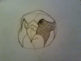 I used lines to mark out where each of the eagles features would be, I started by using a large oval circle to get the head shape right, and a curved line going through the centre of the circle to mark out where it's beak would be. I then began with it's eyes and markings, and this is the point where I started shading...
